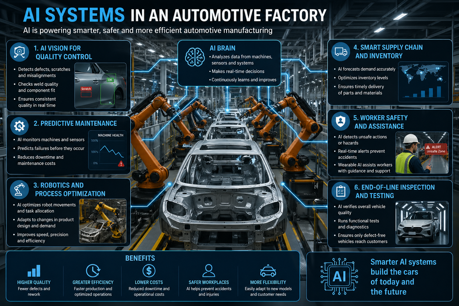 - AI runs across the full automotive value chain — vehicle design, assembly lines, supply chain, quality control, and post-sale service.