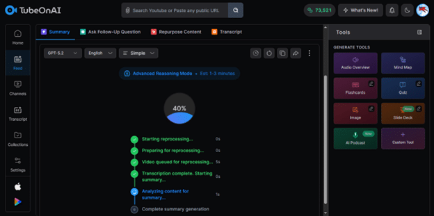 TubeOnAI uses AI to transcribe the video audio, identify the main topics, and organize everything into a structured summary. It works with videos that have subtitles and even those without any transcript available.