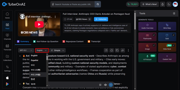 TubeOnAI supports over 40 languages. If the video is in English but you want notes in Spanish, Hindi, Bangla, or any other supported language, just select your preferred language. The tool translates the entire summary while keeping the structure intact.