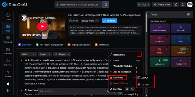 This is where TubeOnAI really shines for anyone who needs their notes outside the platform. Once your summary is generated, you can export it in two formats: