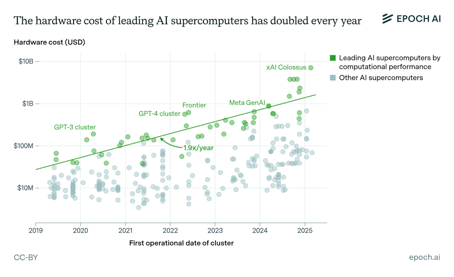 Firms are building increasingly large supercomputers, containing more, and more performant, AI chips. Image credit: Epoch.ai