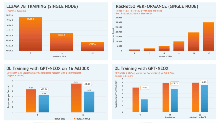 Training workload performance shows equally impressive results. Llama 7B training time reduces from 19 minutes on standard eight-GPU configurations to under five minutes on 32-GPU SuperNODE deployments. ResNet-50 performance scales linearly as additional GPUs join the single-node configuration, maintaining predictable performance characteristics that simplify capacity planning.