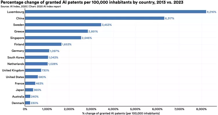 The Stanford 2025 AI Index put it bluntly: “The race is tighter than ever, and no one has a clear lead.” US-based institutions still produced 40 notable AI models in 2024, compared to China’s 15 and Europe’s three. But Chinese models reached near-parity on two critical benchmarks — Massive Multitask Language Understanding (MMLU) and HumanEval — and China already dominates AI patent filings, holding nearly 70% of all global grants. Meanwhile, nations from the Middle East to Southeast Asia are entering the field with their own models and infrastructure, turning what was once a bilateral contest into a genuinely global competition.