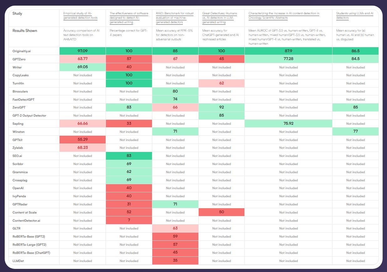 Benchmark results illustrating how different AI detectors compare against each other. Image credit: Originality.ai